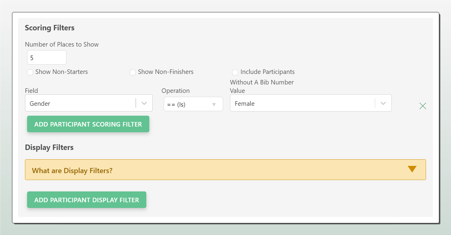 Scoring Filters differ from Display Filters by applying to the participants prior to scoring them, rather than just showing scored participants that meet the display criteria. The Scoring Filter below will show the fastest 5 participants whose Gender is Female.