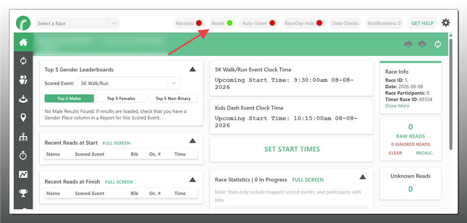 - In RaceDay Scoring, make sure the Reads connector is on