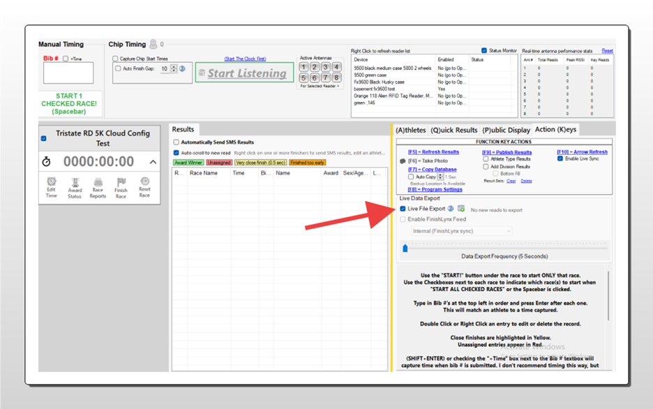 - Either connect to a reader to scan a few tags, or manually enter a bib and time entry in Agee Timing.
